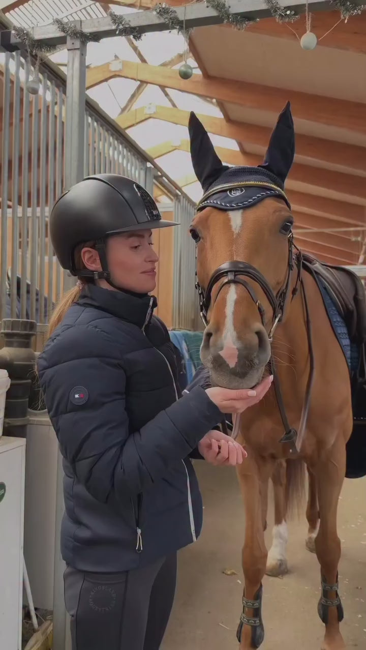 Crocheted in navy blue with refined braided piping and the signature Sense Sport embroidery. Lightweight enough to forget, beautiful enough to notice. Soft elastic ears sit gently, keeping your horse focused and comfortable through every movement.